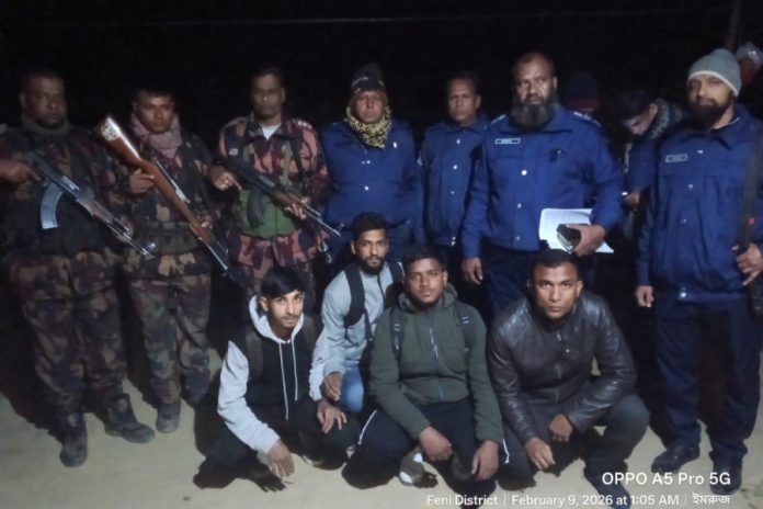 ফেনী বিজিবি এর সংবাদ বিজ্ঞপ্তিতে জানানো হয়, রোববার রাত সাড়ে ১১টার দিকে জেলার পরশুরাম উপজেলার মির্জানগর ইউনিয়নের পূর্ব জাঙ্গালিয়া এলাকা থেকে স্থানীয় জনসাধারণের সহায়তায় বিজিবি ও পুলিশের অভিযানে অবৈধ প্রবেশের চেষ্টাকালে চার বাংলাদেশিকে আটক করা হয়েছে।