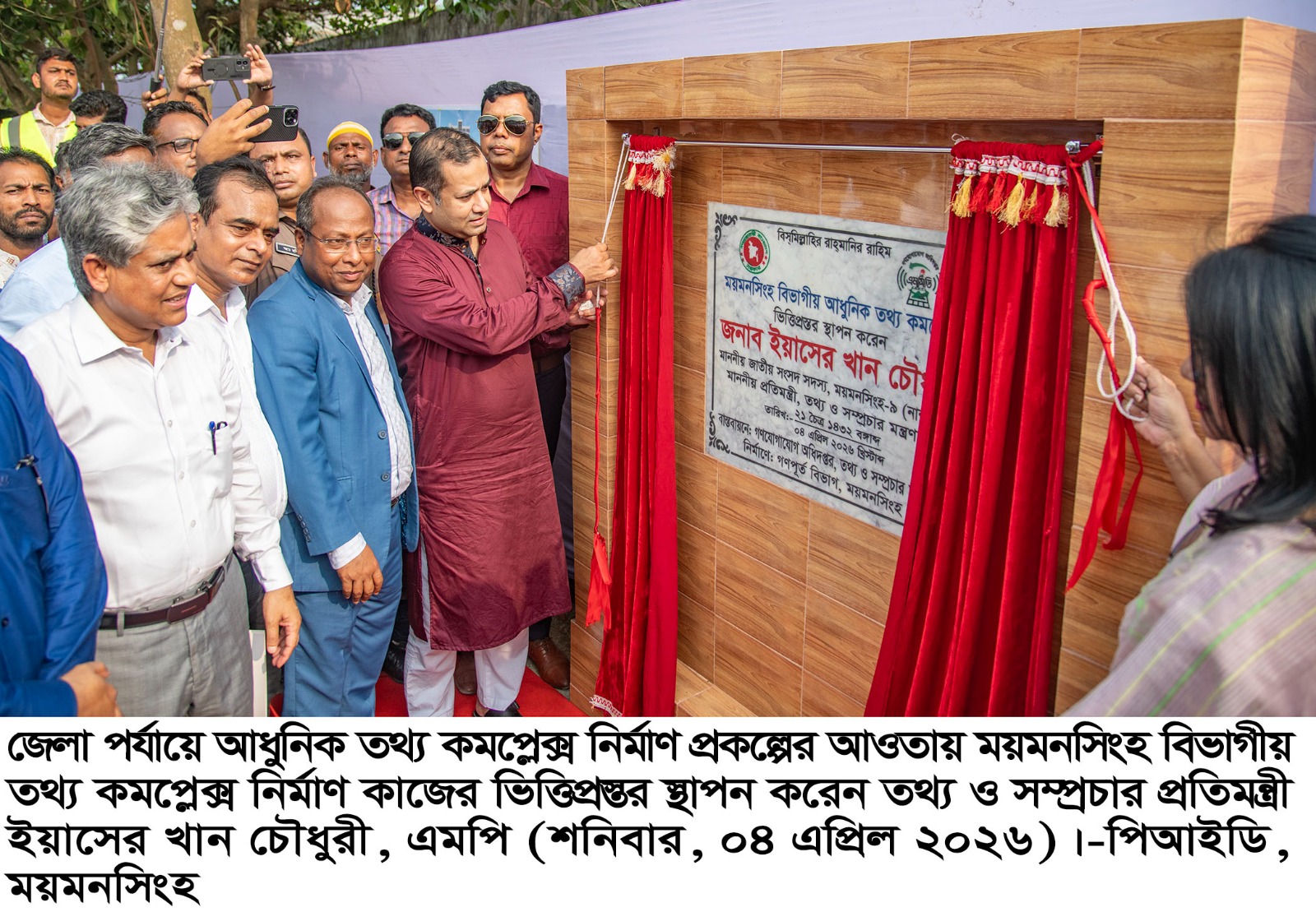 জেলা পর্যায়ে আধুনিক তথ্য কমপ্লেক্স নির্মাণ প্রকল্পের আওতায় ময়মনসিংহ বিভাগীয় তথ্য কমপ্লেক্স নির্মাণ কাজের ভিত্তিপ্রস্তর স্থাপন করেছেন তথ্য ও সম্প্রচার প্রতিমন্ত্রী ইয়াসের খান চৌধুরী।